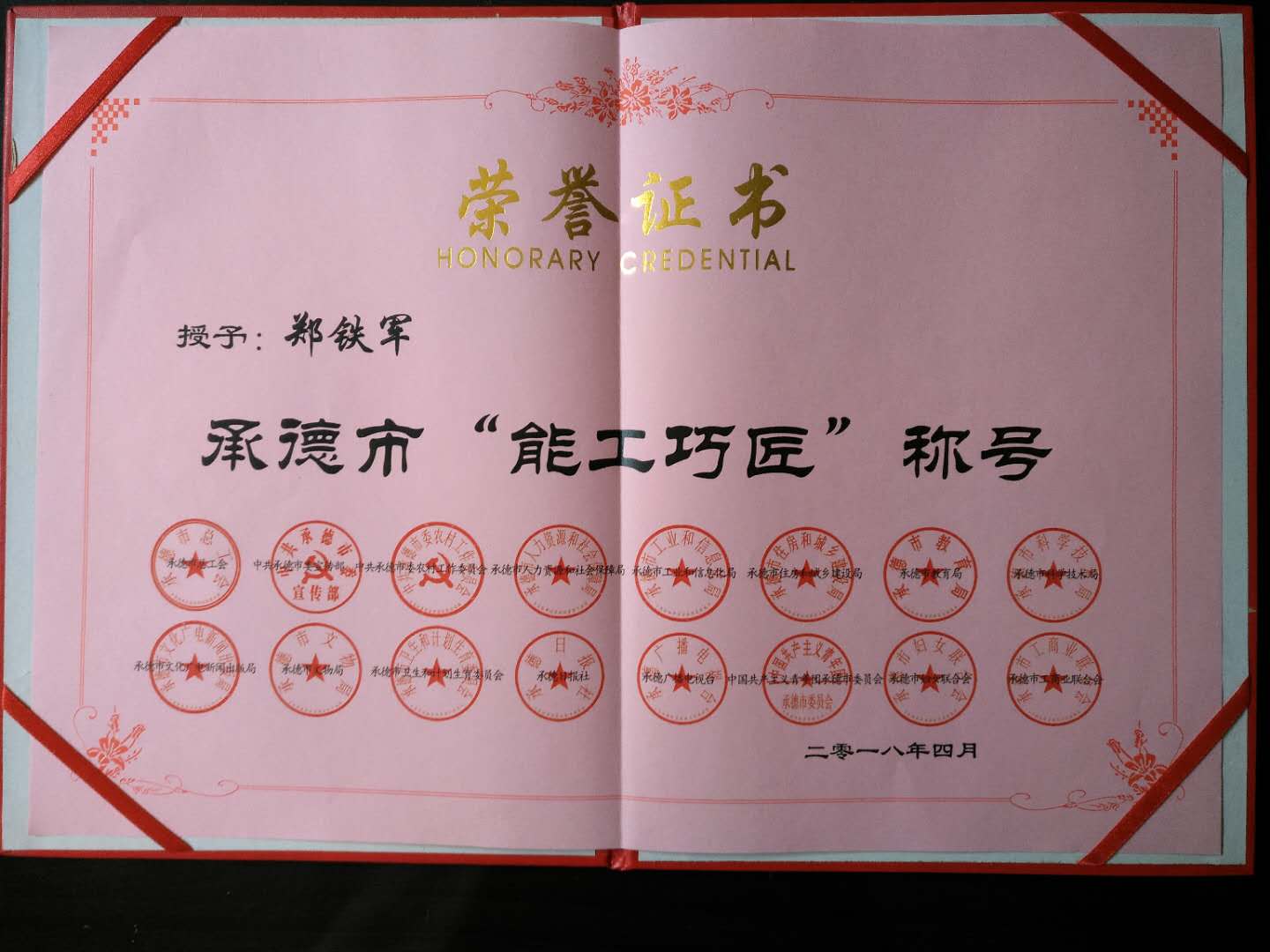2018年4月,經承德市總工會、承德市委宣傳部、市文化廣電新聞出版局、市人力資源和社會保障局等16個大單位聯(lián)合評選,授予公司總經鄭鐵軍同志《承德市“能工巧匠”稱號》,以表彰他在砂畫藝術創(chuàng)新發(fā)展歷程中所做出的突出貢獻。