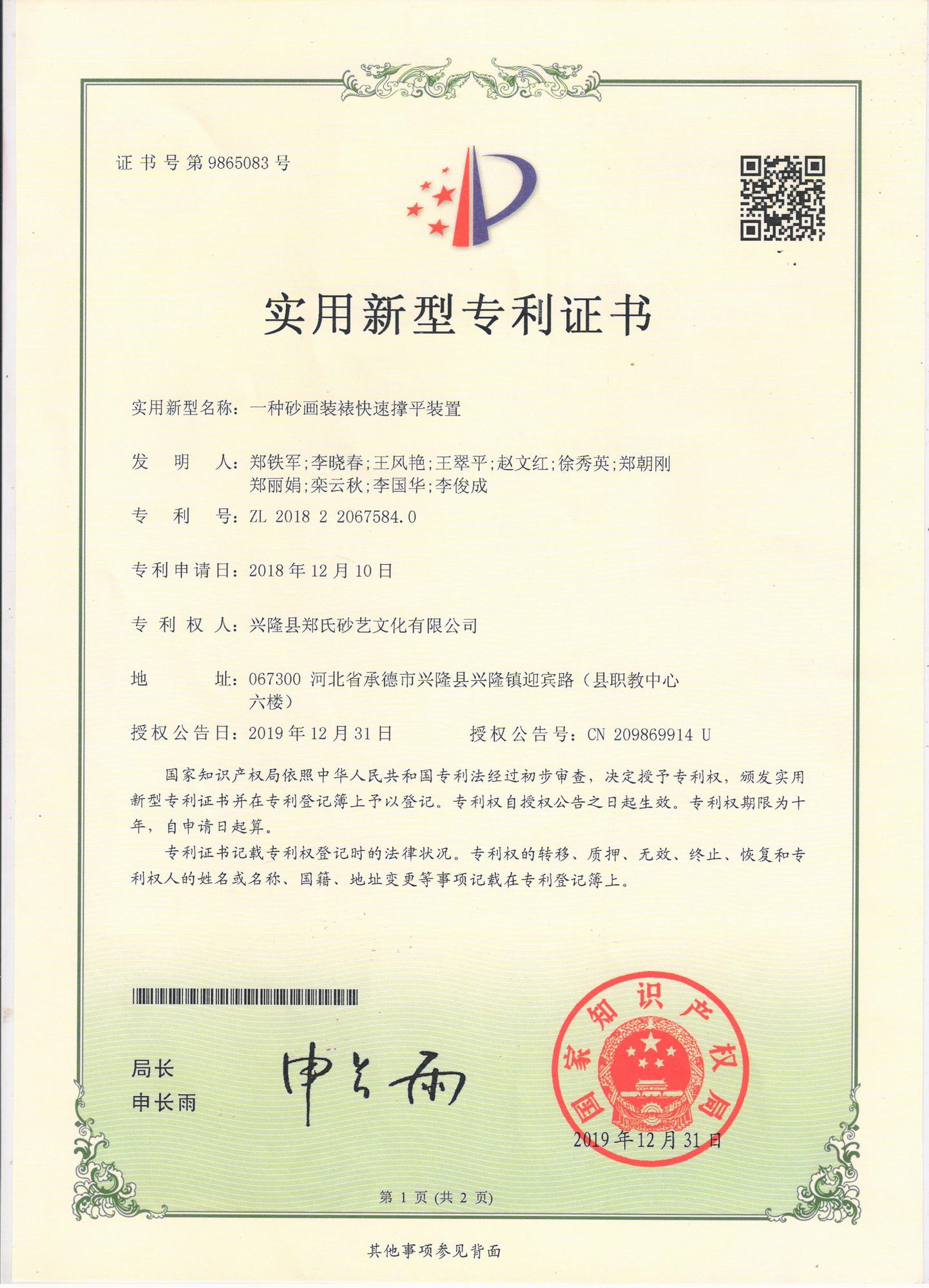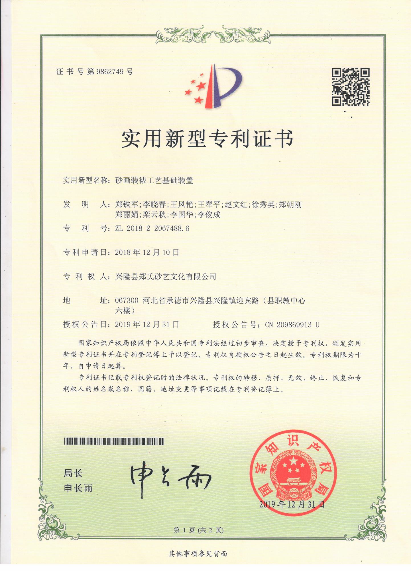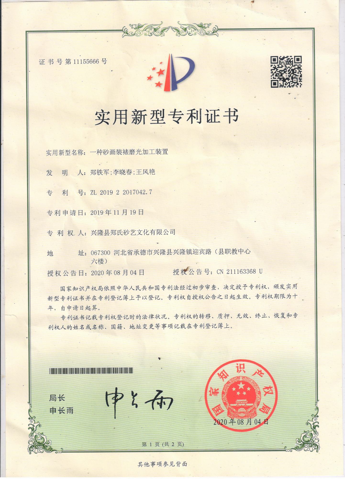 自鄭氏砂藝研究所成立以來,經過研發人員的不懈鉆研和努力,已經陸續研發和申報了9項擁有自主知識產權的實用新型專利,目前為止9項專利全部獲得國家知識產權局的認定。近年來,公司根據自身的生產需求,積極成立了鄭氏砂藝研究所并獲得省工業和信息化廳批準,在研發過程中,公司先后投入數十萬元,通過研發破解了生產過程中的技術難題,9項自主研發專利的成功也標志著鄭氏砂藝研究所逐步走向成熟。
