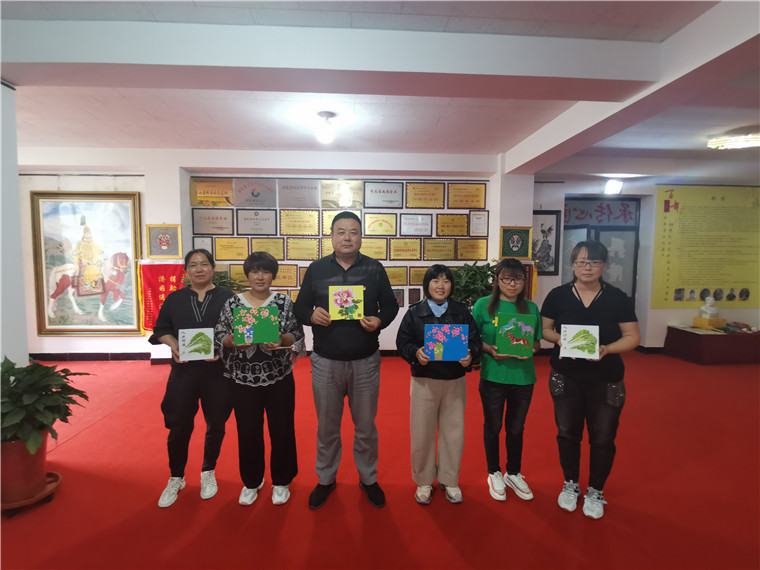 蘑菇峪扶貧生產(chǎn)車(chē)間貧困人員和鄭鐵軍董事長(zhǎng)在鄭氏砂藝非遺展廳合影留念