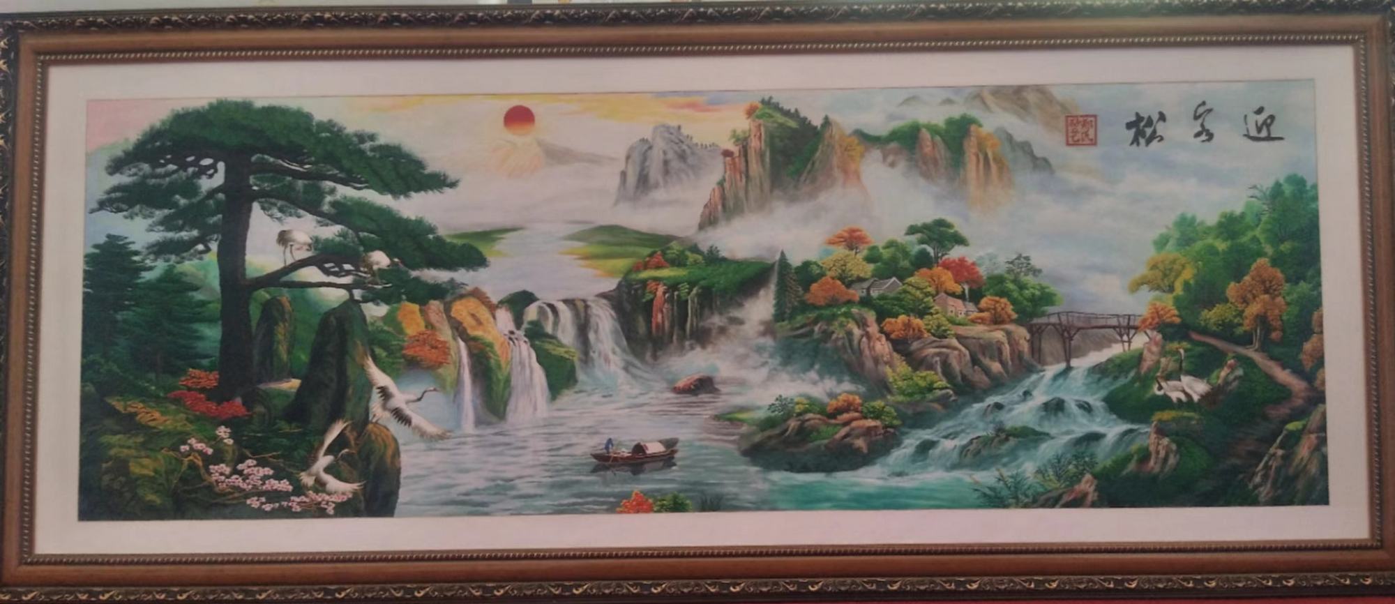 這幅《迎客松》遠景旭日東升,輕煙淡巒,云煙浮動,云霞卷舒;近景綿綿群山,山勢險峻,波濤洶涌,草木澤生,洋溢著盎然生機。而那垂直的瀑布,不禁讓我想起詩仙李白的一首詩:“飛流直下三千尺,疑是銀河落九天”。自古以來,古松便蒼天筆挺,有君子之威風,是祈福之寓意。這幅畫構圖遠虛近實,近景突兀、遠景清雅,筆力剛勁挺拔、渾厚沉著、墨氣明潤,濃淡虛實相生。當然這幅畫寓意迎福招財。是會議室、辦公室和居家裝飾之首選,有生意興旺,迎客招財的祝愿!作品寓意美好,作為禮品贈送給親朋好友也是上佳選擇!