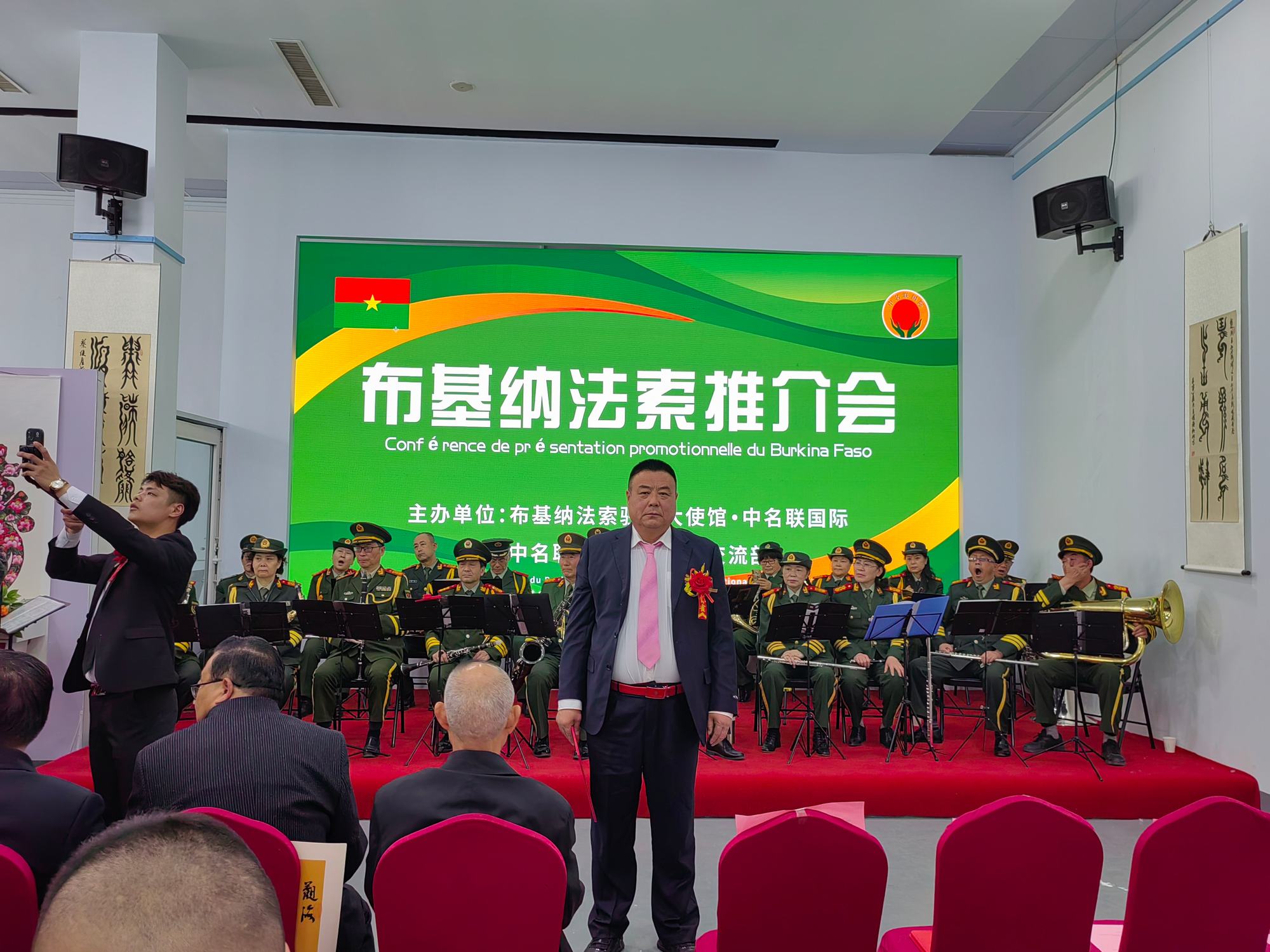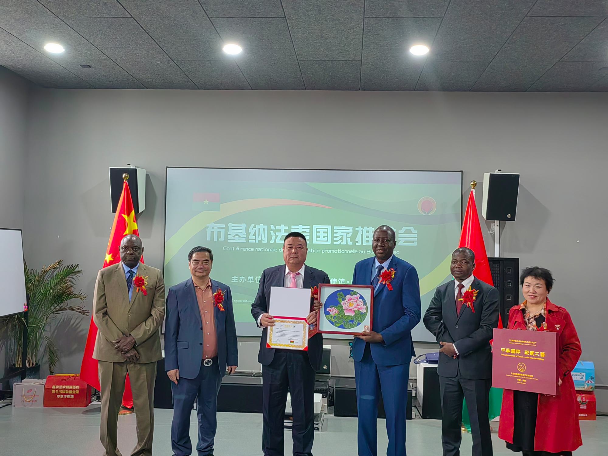 2023年4月12日,興隆縣鄭氏砂藝文化有限公司執(zhí)行董事長(zhǎng)鄭鐵軍參加由布基納法索駐華大使館.中名聯(lián)書(shū)畫(huà)培訓(xùn)國(guó)際交流部主辦的“布基納法索國(guó)家推介會(huì)”和“中名聯(lián)191期經(jīng)濟(jì)與藝術(shù)交流會(huì)”。會(huì)上,布基納法索共和國(guó)駐華大使團(tuán)、商務(wù)代表團(tuán)一行對(duì)鄭鐵軍的砂畫(huà)作品高度贊賞,并現(xiàn)場(chǎng)簽訂了訂購(gòu)協(xié)議,頒發(fā)了收藏證書(shū),授予鄭鐵軍“中非文化交流使者”榮譽(yù)稱號(hào)。