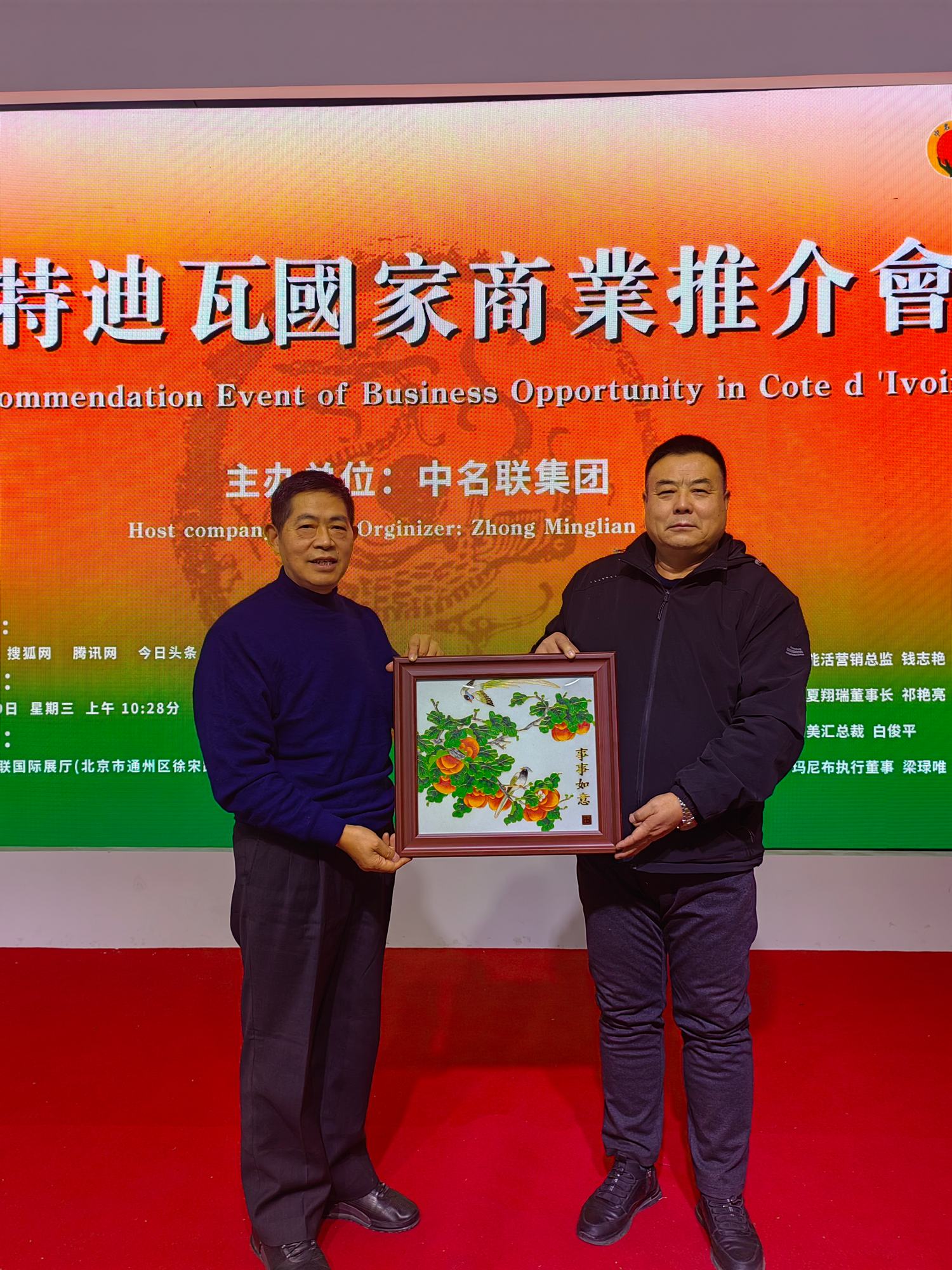 2023年11月29日,科特迪瓦國(guó)家商業(yè)推介會(huì)在北京中名聯(lián)國(guó)際展廳盛大召開(kāi),興隆縣鄭氏砂藝文化有限公司董事長(zhǎng)鄭鐵軍應(yīng)邀參加了此次推介會(huì),鄭鐵軍董事長(zhǎng)在會(huì)上對(duì)鄭氏砂藝的傳承和發(fā)展進(jìn)行了簡(jiǎn)要介紹,現(xiàn)場(chǎng)展示的鄭氏砂藝作品《興隆山楂》《旭日東升》《事事如意》等作品深受與會(huì)企業(yè)家贊揚(yáng),并進(jìn)行了現(xiàn)場(chǎng)收藏。