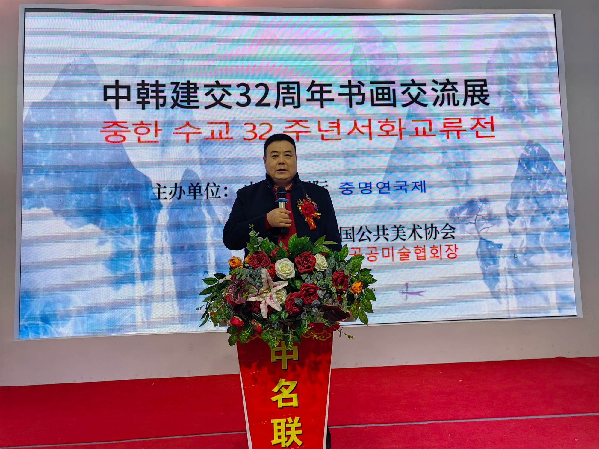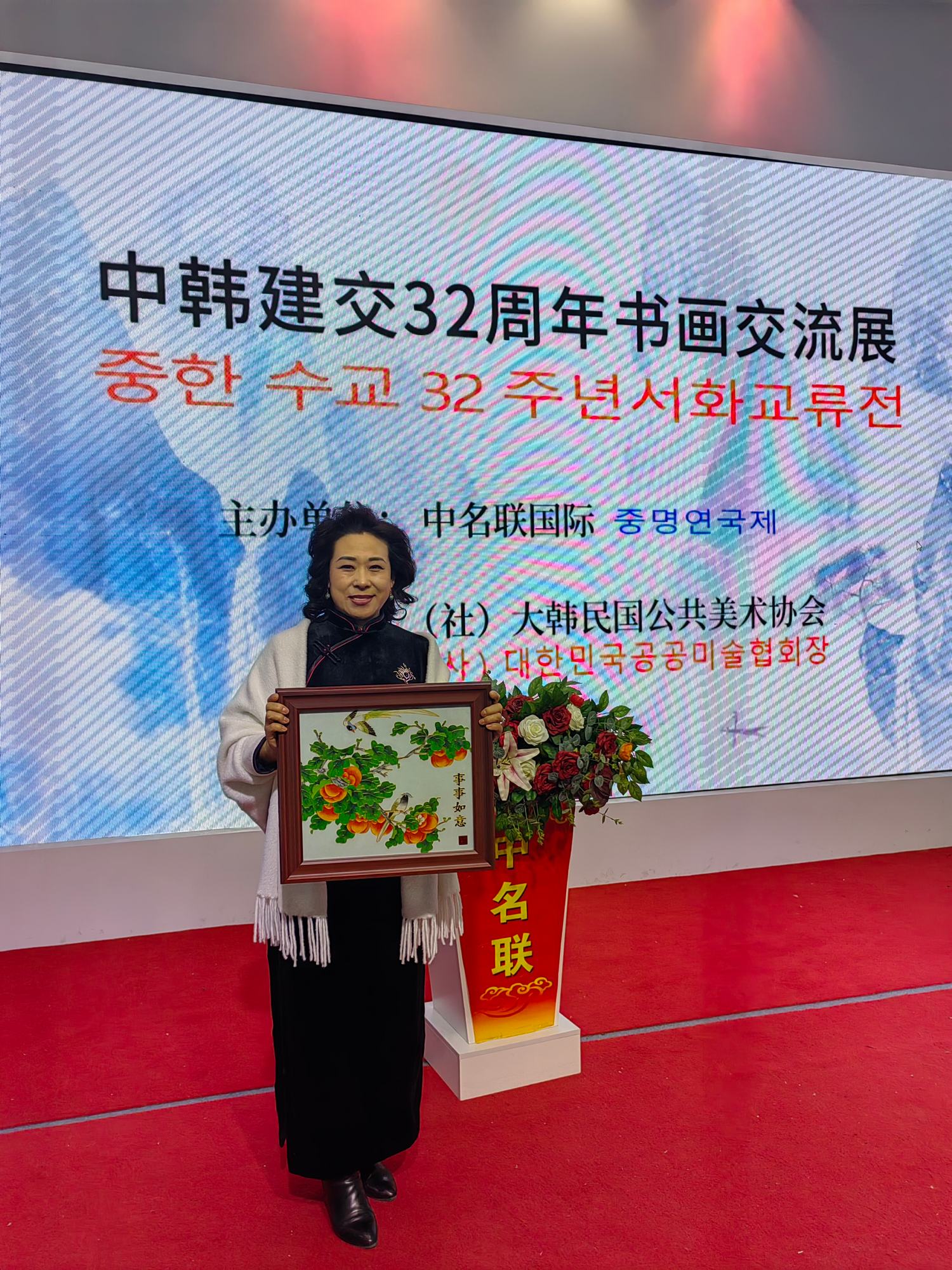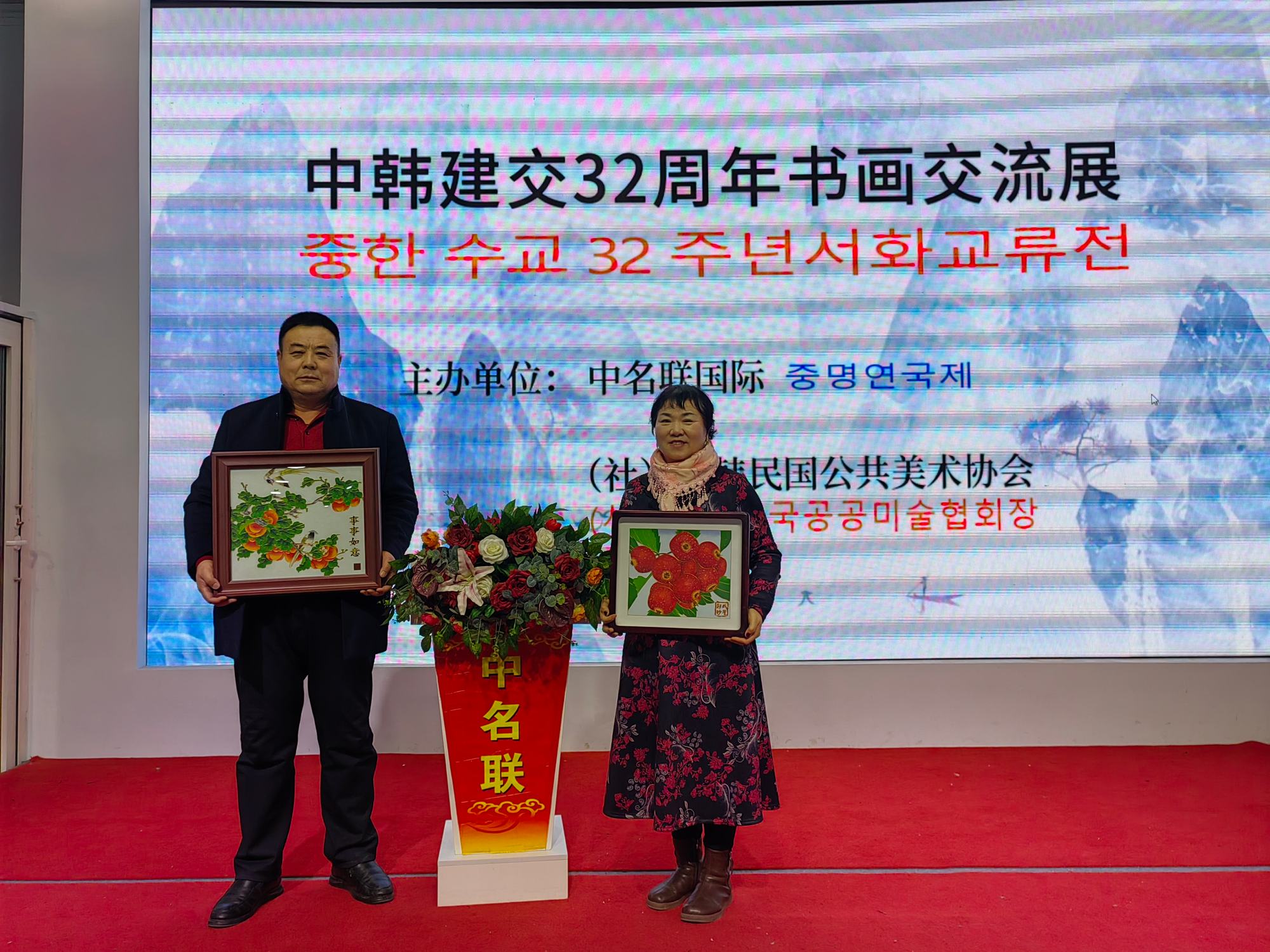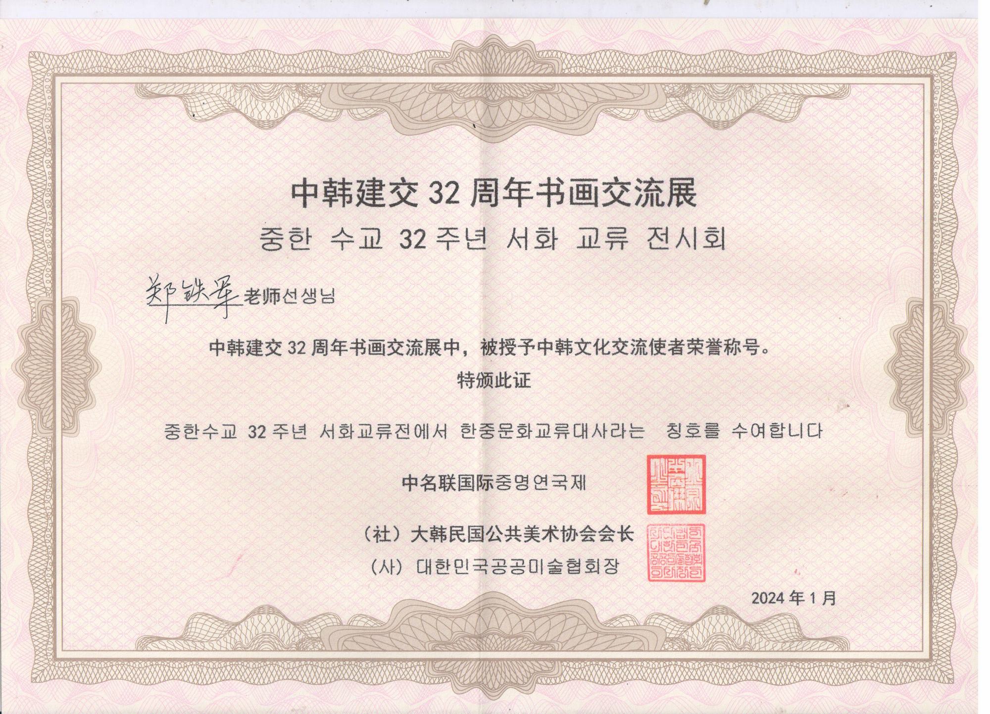 2024年1月28日,中韓建交32周年中韓藝術交流展在北京中名聯國際展廳隆重召開,活動由中名聯國際和大韓民國公共美術協會共同主辦,主要目的是加深中韓藝術家們的友誼和文化交流,加強中韓兩國人民友誼。鄭氏砂藝第五代非遺傳承人、中名聯簽約國禮藝術家鄭鐵軍先生應邀出席了此次活動,其鄭氏砂藝(畫)被大韓民國公共美術協會永久收藏,并授予鄭鐵軍“中韓文化交流使者”榮譽稱號。同時,韓方表示屆時將邀請中名聯簽約國禮藝術家赴韓國國會展覽,搭建中韓深化文化藝術交流橋梁。