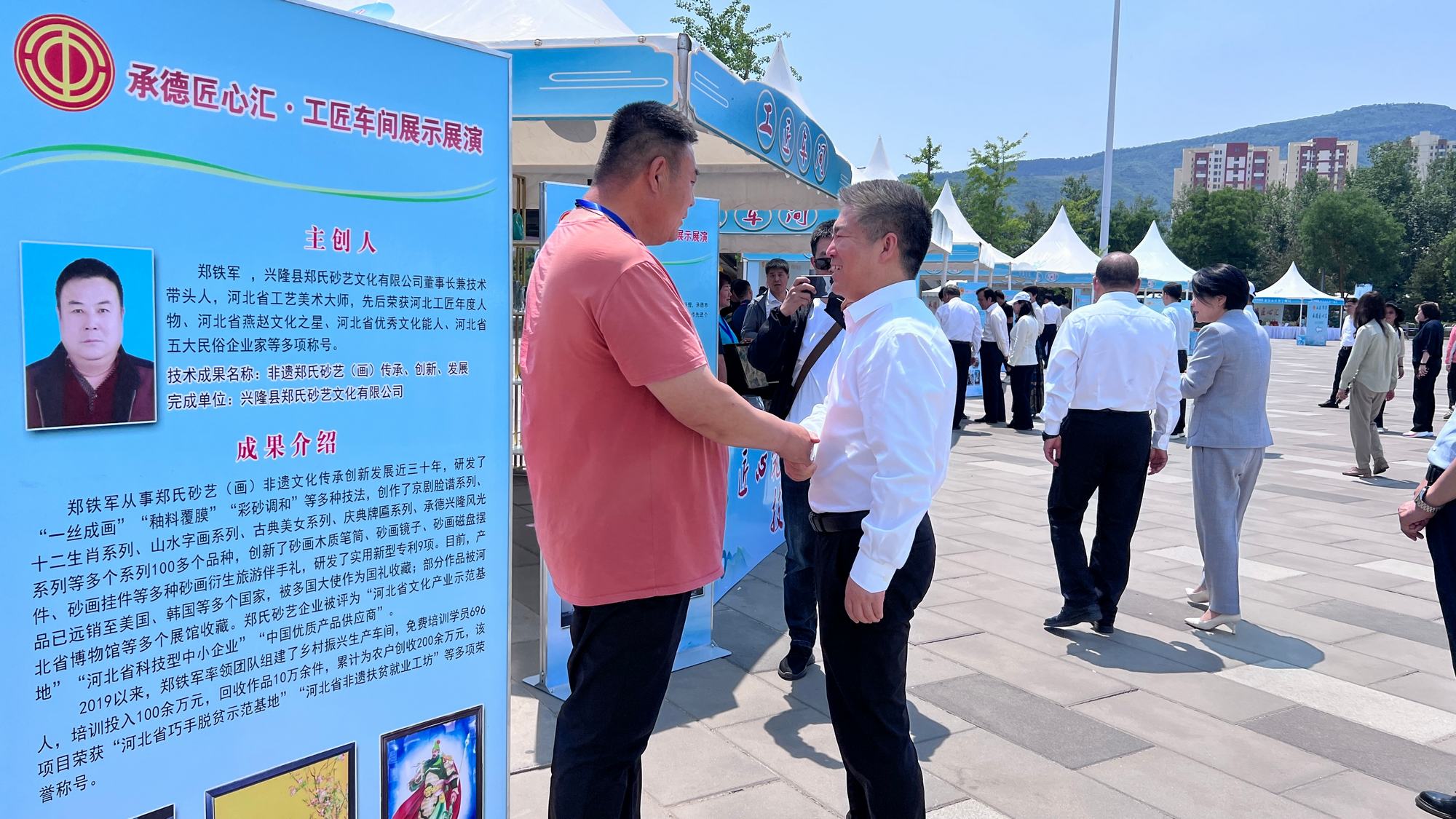 為向全國職工展示我省、我市工匠代表典型創新成果、精湛的操作技能,非遺傳承以及智慧文創的文化魅力,同時在奧體中心還舉辦了“承德匠心匯——工匠•市集”展示展演活動,鄭氏砂藝(畫)等二十余個承德非遺文化項目的勞模工匠代表匯聚一堂,向全國職工和當地市民展示了自身的高超技藝,展現了承德工匠們堅守執著、精益求精、專業專注、追求極致和一絲不茍的工匠精神。