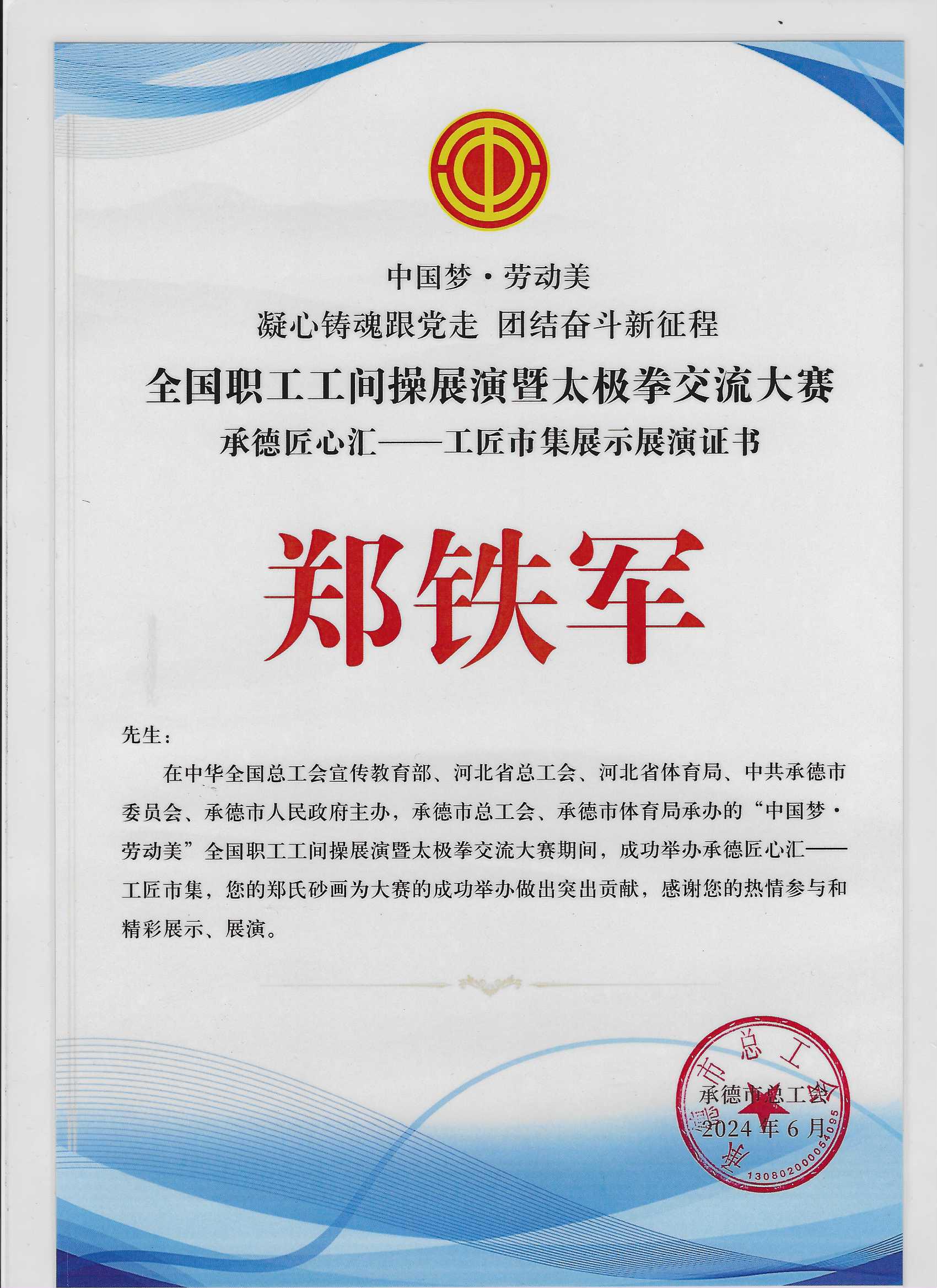 2024年6月4日,由全國總工會宣傳教育部、河北省總工會、河北省體育局、承德市委市政府聯合舉辦的“中國夢·勞動美——凝心鑄魂跟黨走 團結奮斗新征程”全國職工工間操展演暨太極拳交流大賽活動在承德市奧體中心開幕。本次大賽為期三天,包括工間操展演大賽、太極拳交流大賽、健步走大賽,共有來自各省、自治區、直轄市,各全國產業工會、中央和國家機關工會聯合會的36支參賽隊600余名職工參賽。