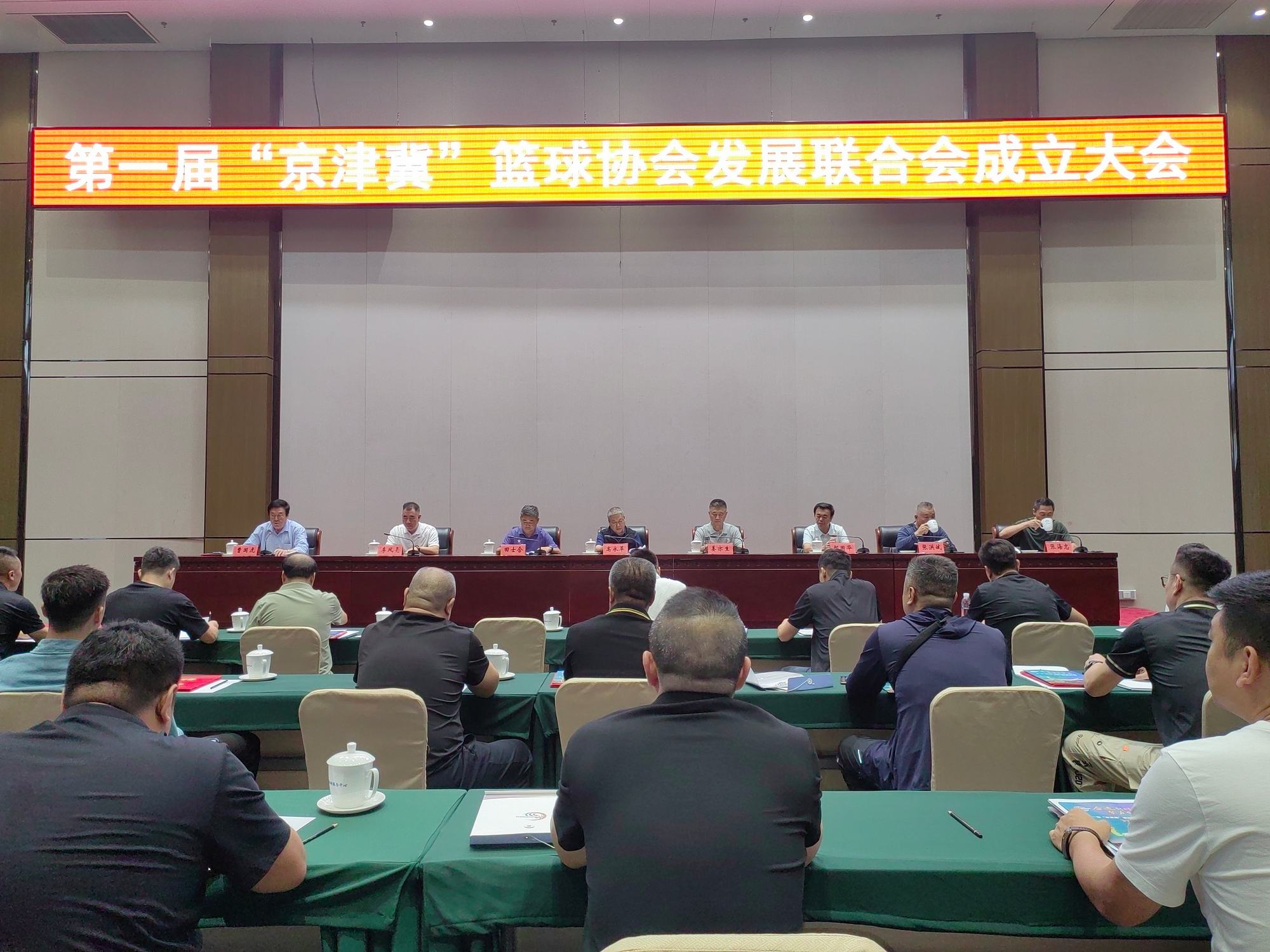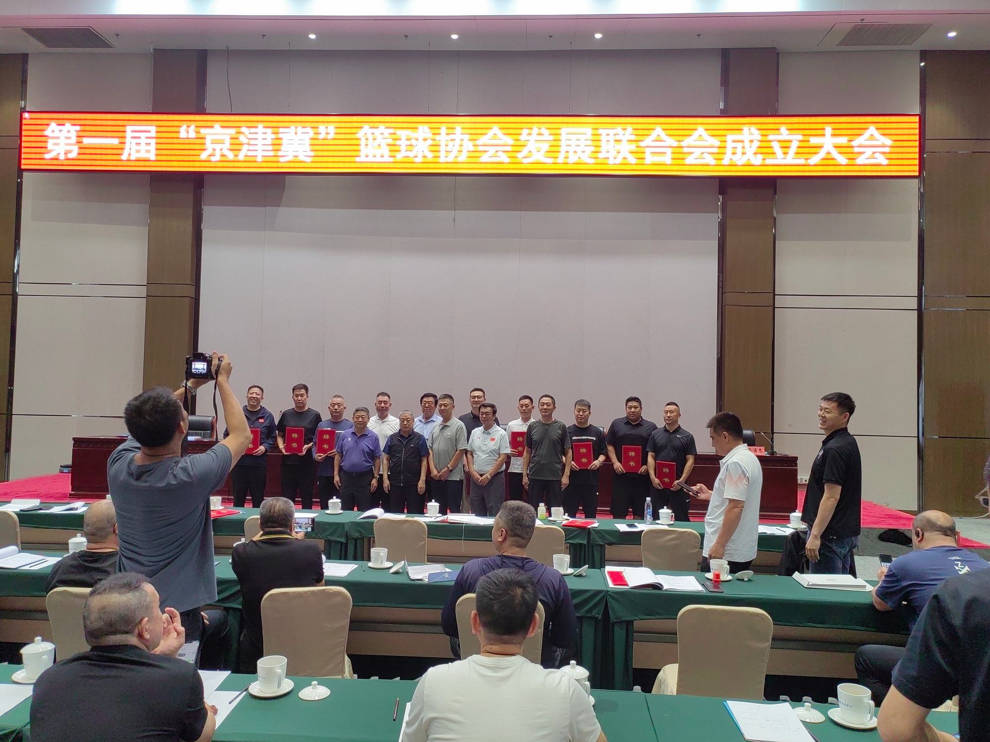 2024年9月12日上午,第一屆“京津冀”籃球協(xié)會發(fā)展聯(lián)合會成立大會于在北京市懷柔區(qū)雁棲湖勝利召開,參加會議的有北京市通州區(qū)籃球運(yùn)動協(xié)會主席曹國虎、北京市懷柔區(qū)籃球協(xié)會主席李鳳亮、北京市大興區(qū)籃球協(xié)會主席張海忠、北京市平谷區(qū)籃球運(yùn)動協(xié)會主席張亞東、北京市門頭溝區(qū)籃球協(xié)會主席王會、北京市密云區(qū)籃球運(yùn)動協(xié)會主席王懷平、北京市西城區(qū)籃球?qū)I(yè)委員會關(guān)雨、北京市東城區(qū)籃球運(yùn)動協(xié)會主席董瑋、北京市朝陽區(qū)籃球運(yùn)動協(xié)會主席劉杰、北京市房山區(qū)籃球運(yùn)動協(xié)會主席馬德亮、北京市懷柔區(qū)神韻訓(xùn)練基地王潘磊、天津市武清區(qū)籃球協(xié)會主席楊瑞偉、天津市西青區(qū)籃球運(yùn)動協(xié)會主席趙犀、天津市東麗區(qū)籃球協(xié)會主席徐海泉、天津?yàn)I海新區(qū)籃球協(xié)會主席趙國萍、天津市北辰區(qū)籃球運(yùn)動協(xié)會主席賈蔚亞、天津市寶坻區(qū)籃球協(xié)會主席王懷瑤、天津市薊州區(qū)籃球協(xié)會主席蘇昌亮、天津市寧河區(qū)籃球協(xié)會主席馬立勇、河北省廊坊市籃球運(yùn)動協(xié)會主席裴羅江、河北省廊坊市香河縣籃球協(xié)會主席劉棟、河北省廊坊市三河市籃球協(xié)會主席孫明明、河北省廊坊市大廠回族自治縣籃球協(xié)會主席張金凱、河北省廊坊市文安縣籃球協(xié)會主席相東、河北省廊坊市霸州市籃球協(xié)會主席閆寶光、河北省廊坊市固安縣籃球協(xié)會主席楊衛(wèi)華、河北省承德市興隆縣籃球協(xié)會主席鄭鐵軍、副主席李柏林、河北省滄州市任丘市籃球協(xié)會主席賈建松、河北省滄州市籃球協(xié)會主席張國強(qiáng)、河北豐寧滿族自治縣籃球協(xié)會主席何曉川等相關(guān)領(lǐng)導(dǎo)。