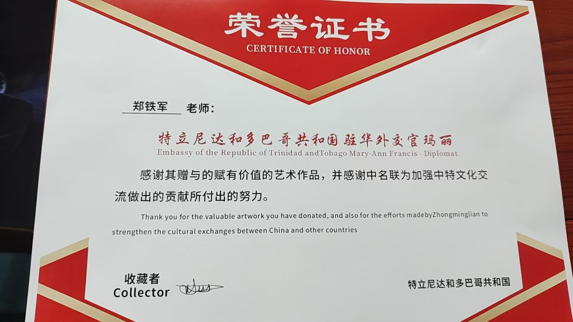 近日,應特立尼達和多巴哥共和國駐華大使館的誠摯邀請,鄭氏砂藝(畫)形象代言人劉秀華女士攜中名聯簽約國禮藝術家鄭鐵軍老師的砂藝作品,踏入使館殿堂,為兩國文化交流增添了新的色彩。