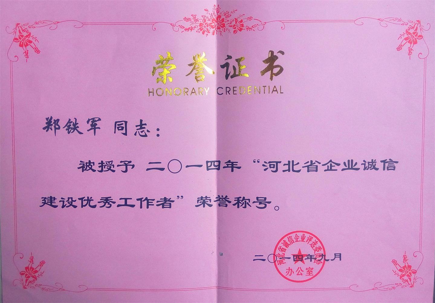 9月26日,河北省誠(chéng)信企業(yè)評(píng)選委員會(huì)辦公室和河北省企業(yè)家協(xié)會(huì)同省有關(guān)部門通報(bào)表彰“河北省誠(chéng)信企業(yè)”及“河北省企業(yè)誠(chéng)信建設(shè)優(yōu)秀工作者”。興隆縣鄭氏砂藝有限公司榮獲“河北省誠(chéng)信企業(yè)”榮譽(yù)稱號(hào);公司總經(jīng)理鄭鐵軍被授予“河北省誠(chéng)信企業(yè)建設(shè)優(yōu)秀工作者”榮譽(yù)稱號(hào)。“河北省誠(chéng)信企業(yè)”及“河北省企業(yè)誠(chéng)信建設(shè)優(yōu)秀工作者”評(píng)選活動(dòng)每?jī)赡杲M織開展一次。2014年,經(jīng)過(guò)公司申報(bào)、基層相關(guān)部門審查推薦、省相關(guān)主管部門復(fù)審、評(píng)審專家委員會(huì)審核評(píng)選、社會(huì)公示等程序獲此稱號(hào)。這是公司首次獲此殊榮。