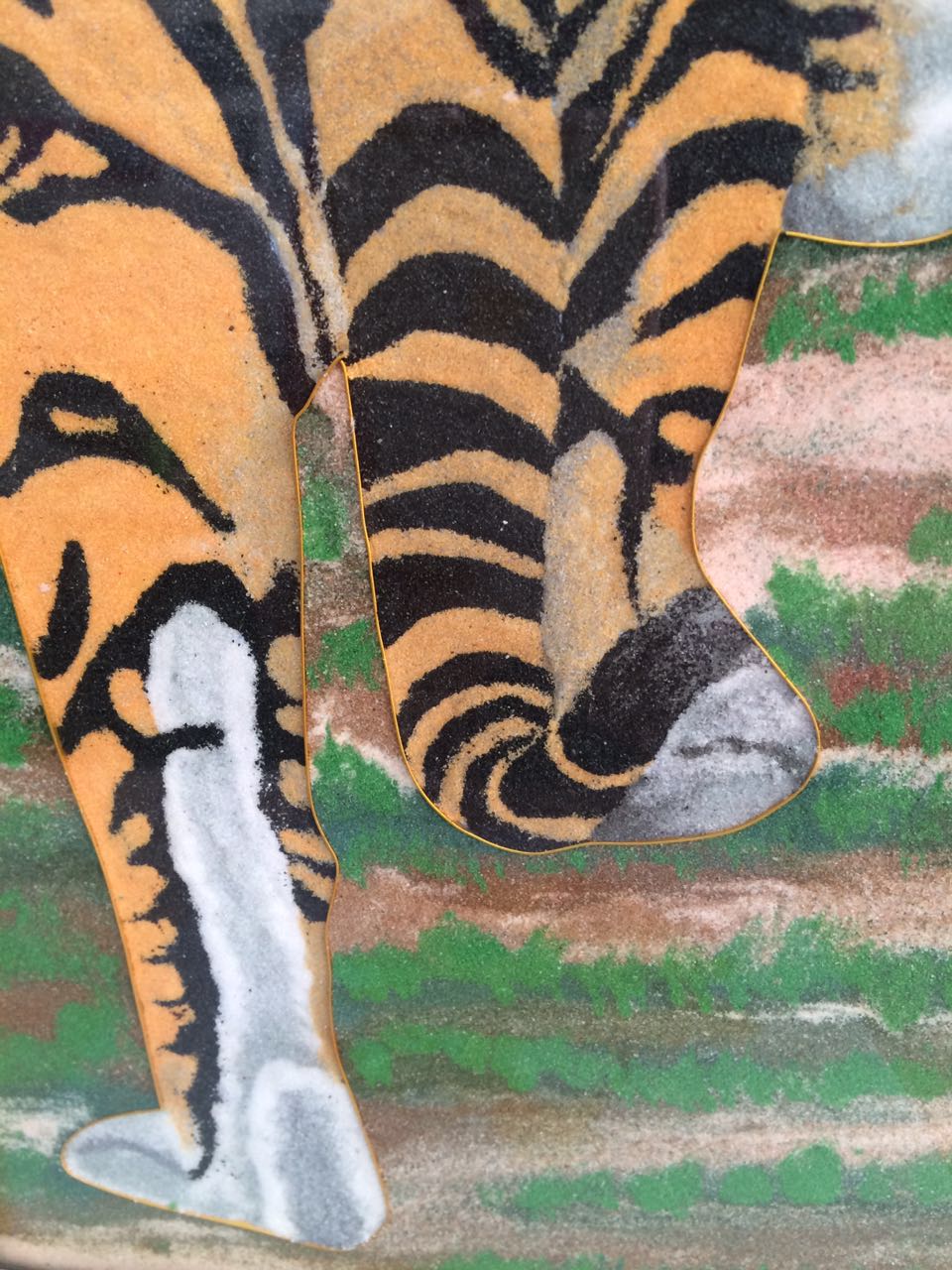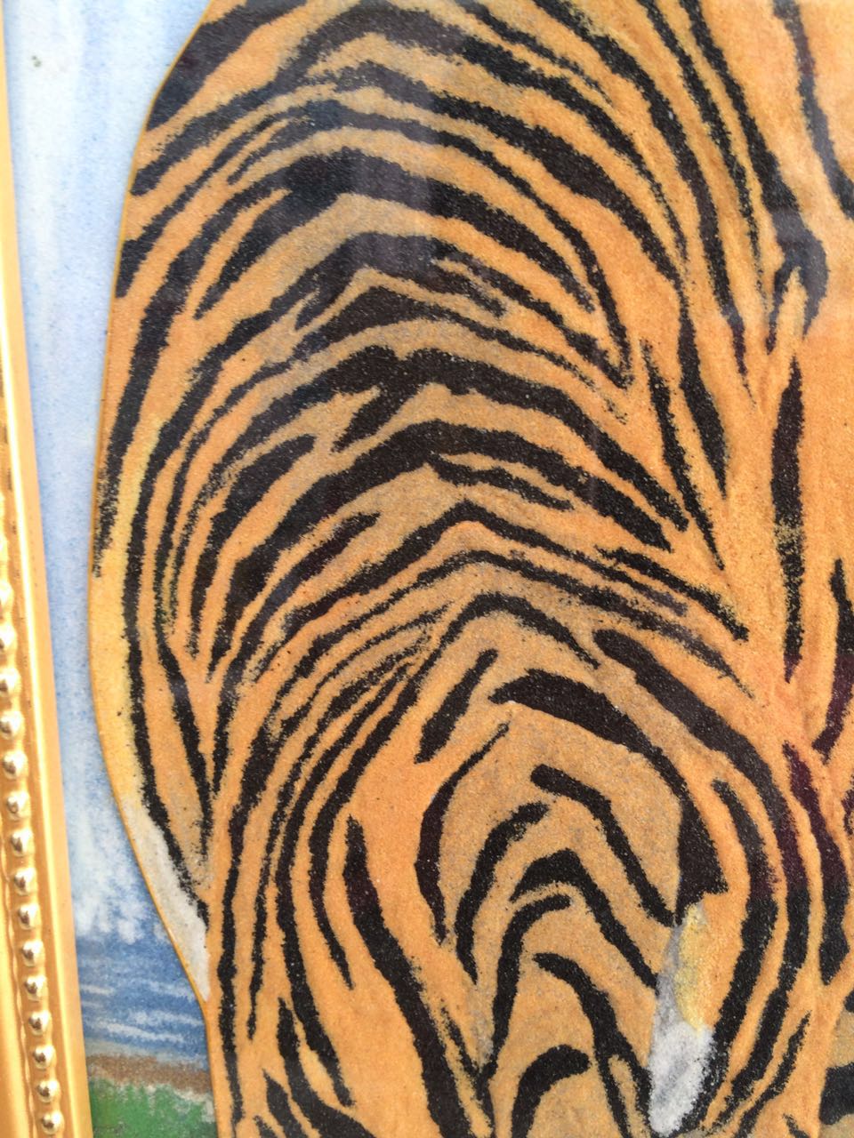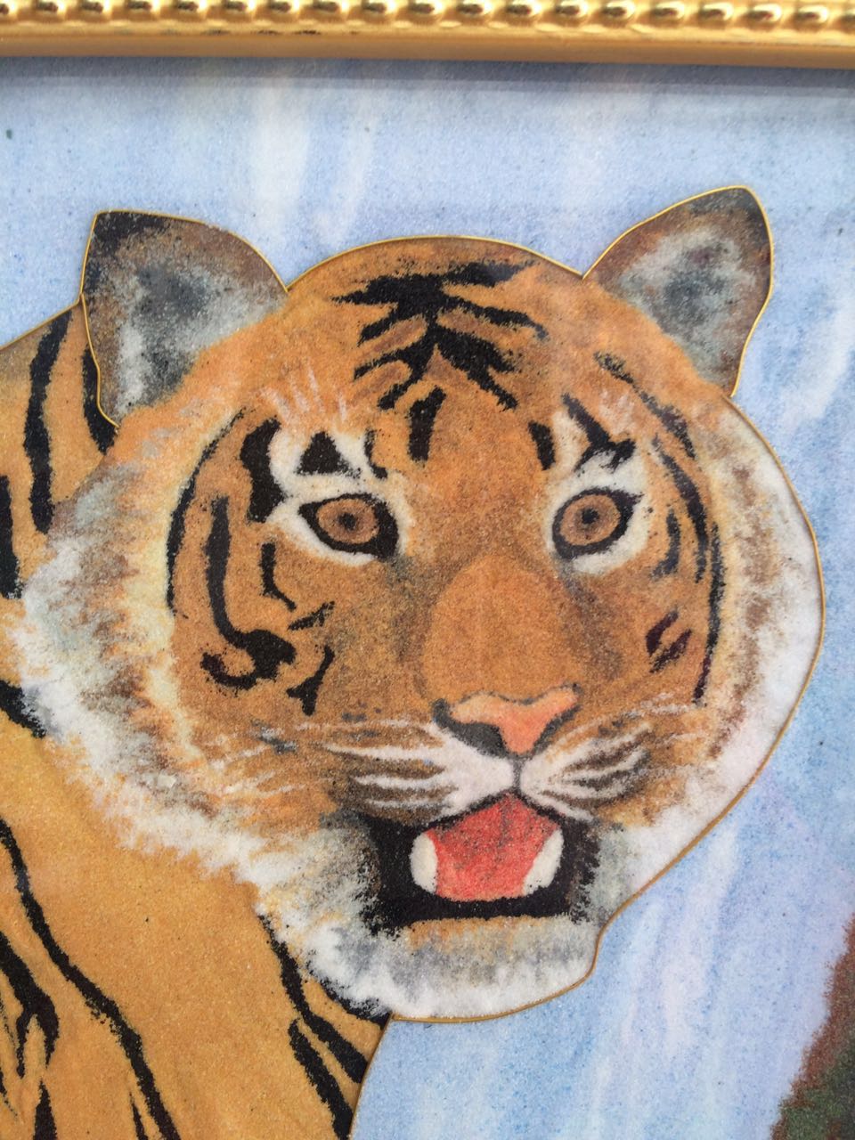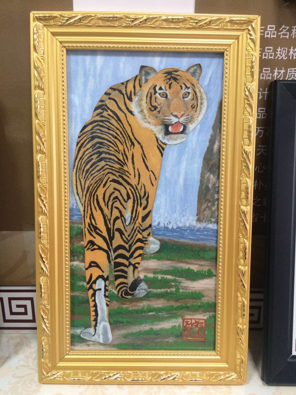 《老虎》28*58*3.5cm(長*寬*高),該產品以老虎作為畫的主題, 老虎屬大型貓科動物;毛色淺黃或棕黃色,滿有黑色橫紋;頭圓、耳短,耳背面黑色,中央有一白斑甚顯著;四肢健壯有力;尾粗長,具黑色環紋,尾端黑色。鄭氏金絲彩砂畫采用金銀絲與彩砂結合,填制出一只威猛的老虎。